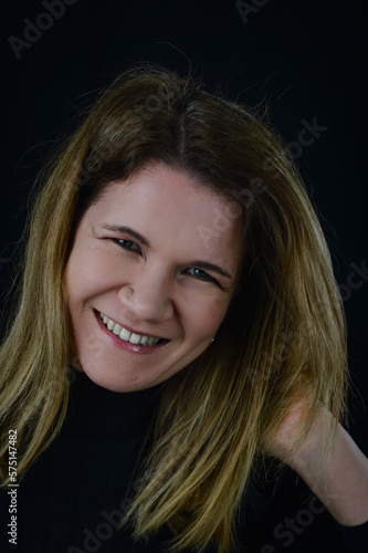 portrait of a beautiful blonde woman happily laughing while adjusting her hair
