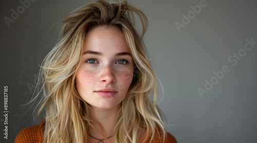 Portrait of a beautiful blonde woman with freckles against a soft gray background