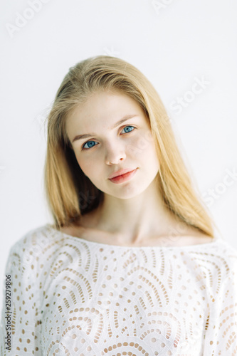 Portrait of a beautiful bride in a minimalist interior. Wedding in European style fine art.