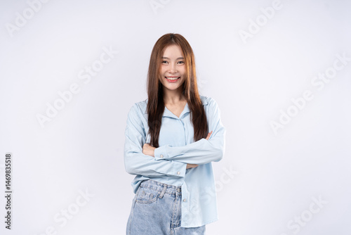 Portrait of a beautiful brown haired woman in a shirt, standing with her arms crossed and smiling brightly, charmingly and shyly.