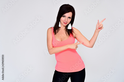 Portrait of a beautiful brunette woman in a coral t-shirt on a white background. Stands in different poses with emotions. Great makeup and beautiful hair.