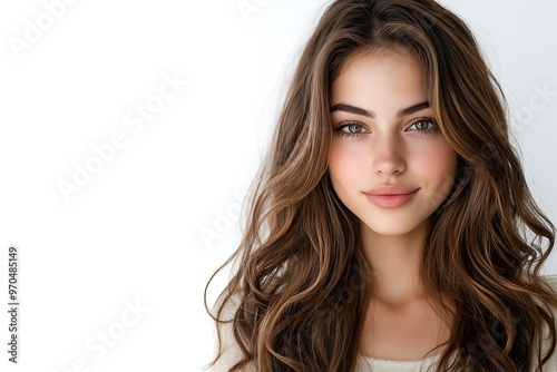Portrait of a beautiful brunette woman with luxurious long hair isolated on white background