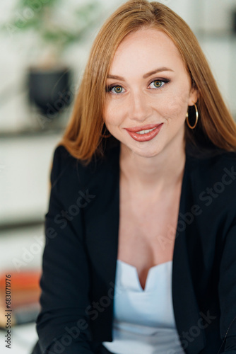 portrait of a Beautiful businesswoman with long red hair in black business suit.