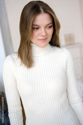 portrait of a beautiful elegant brown-haired woman in a light knitted dress with a high neck looking, head down and looking down to the side