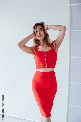 Portrait of a beautiful fashionable blonde woman in a red dress in a white room
