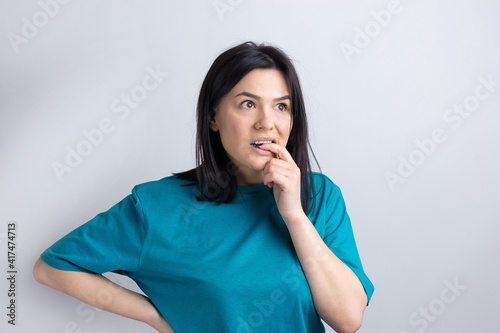 Portrait of a beautiful girl in a blue t-shirt, looks aside with pensive expression, is considering a plan for further action.