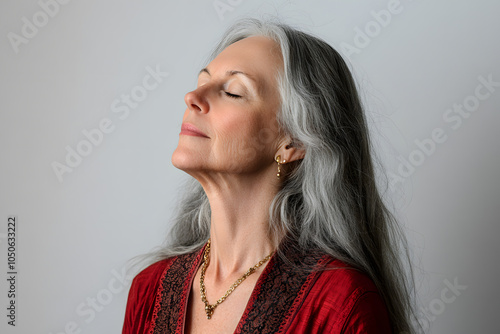 Portrait of a beautiful happy retired mature woman closing eyes and breathing deeply isolated on white background