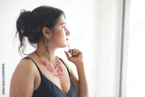 Portrait of a beautiful Indian Bengali brunette woman wearing a black western dress looking thoughtfully while standing near a balcony with a glass door. Indian lifestyle and fashion portrait