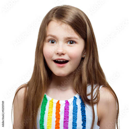 Portrait of a beautiful little cheerful girl. Enthusiastic child on a white background