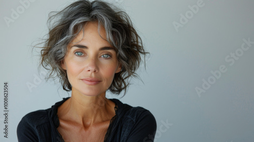 portrait of a beautiful mature Caucasian woman with well-groomed skin looking at the camera. studio shooting white background. copyspace