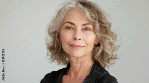 portrait of a beautiful middle-aged Caucasian woman with well-skinned face looks at the camera, studio portrait, white background.