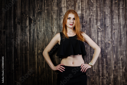 Portrait of a beautiful redheaded girl in black top and black skirt posing in the studio next to the wooden wall.