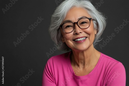 Portrait of a beautiful senior Asian woman with silver hair, glasses, and a pink shirt, smiling at the camera.