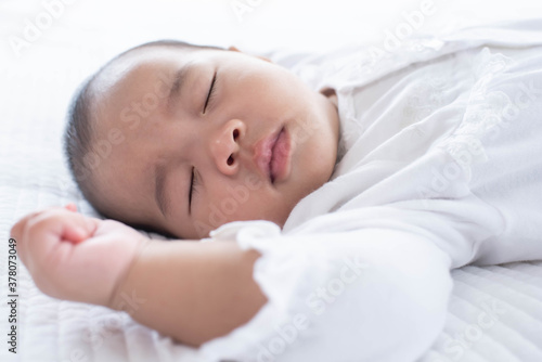 portrait of a beautiful sleeping baby on white. Cute little baby sleeping on bed at home.