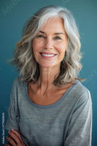 Portrait of a beautiful smiling senior woman on blue background. Happy, relaxed adult grey-haired