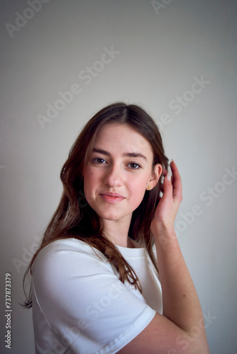 portrait of a beautiful teenage girl on a chair in a bright room in a minimalist style