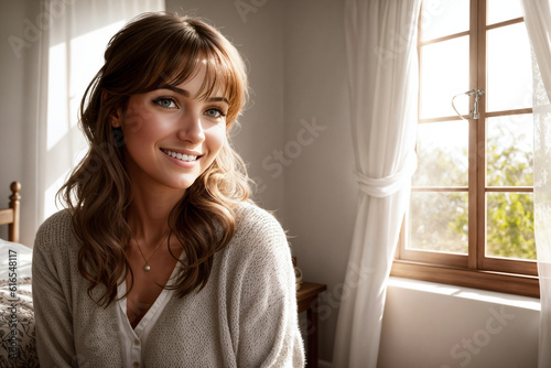 Portrait of a beautiful woman sitting on a bed near window in a bedroom. Generative AI.