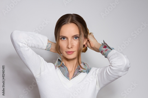Portrait of a beautiful woman straightening long hair in her hairstyle