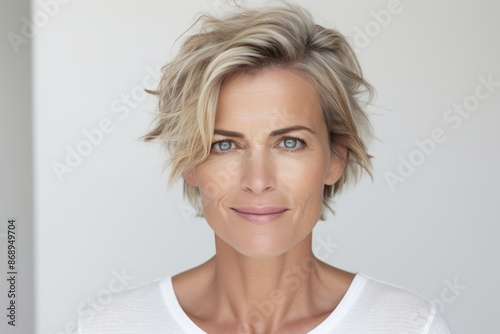 Portrait of a beautiful woman with short blond hair in front of a white wall