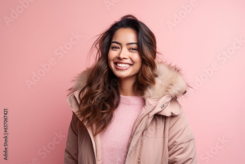 Portrait of a beautiful young asian woman wearing winter jacket on pink background