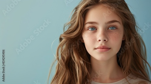 portrait of a beautiful young caucasian white American model teen girl looking forward. child ad with copy space, children, beauty, pretty