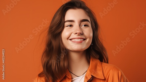 Portrait of a beautiful young girl on an orange background.Generative Ai