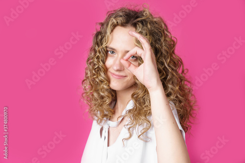 Portrait of a beautiful young woman makes a ok gesture, demonstrates agreement, loves an idea, smiles happily, models indoors. Well thank you.