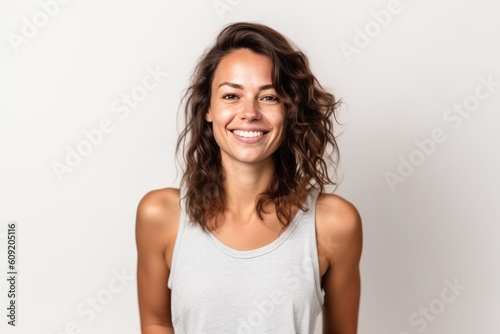 Portrait of a beautiful young woman smiling on a white background.