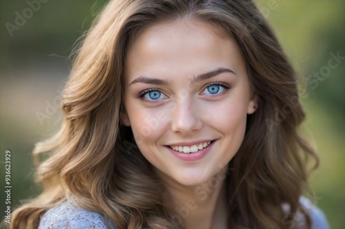 Portrait of a beautiful young woman with blue eyes and brown hair.
