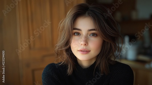 Portrait of a beautiful young woman with brown hair looking at the camera with a warm smile. She is wearing a black sweater.