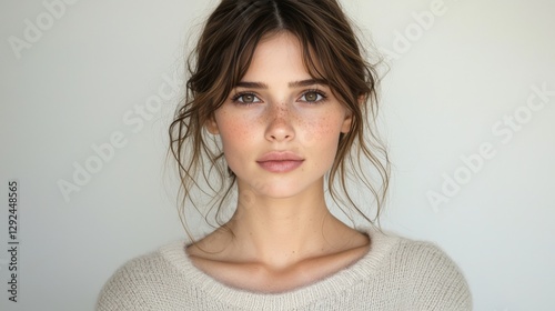 Portrait of a Beautiful Young Woman with Freckles and Natural Makeup