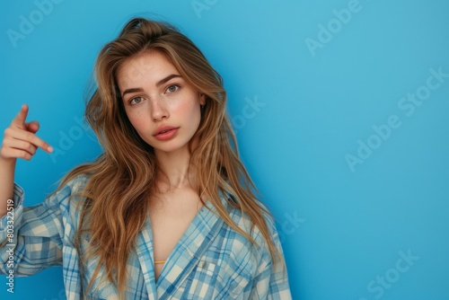Portrait of a beautiful young woman with long blond hair pointing at the camera