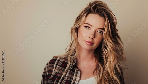 Portrait of a Beautiful Young Woman with Long Blonde Hair and a Plaid Shirt