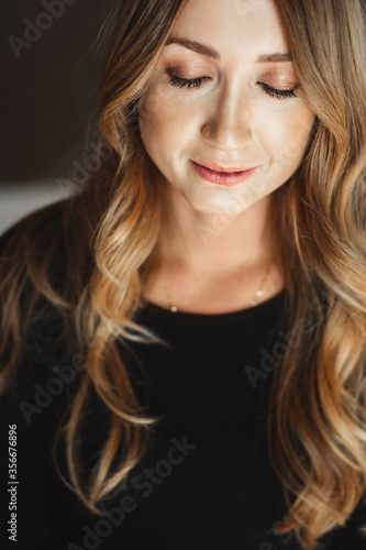 Portrait of a beautiful young woman with long hair. Naturalness. Eyes are closed.