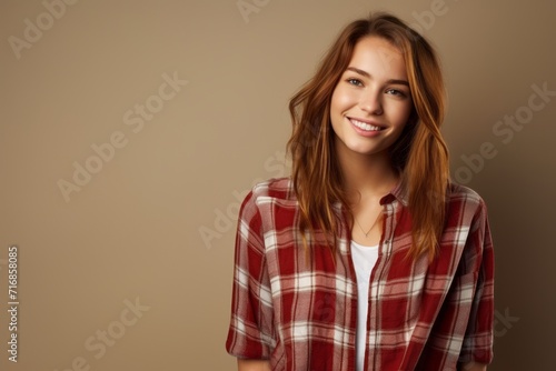 Portrait of a blissful woman in her 20s wearing a comfy flannel shirt against a blank studio backdrop. AI Generation