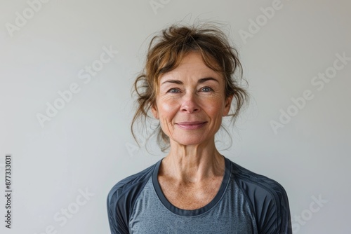 Portrait of a blissful woman in her 50s wearing a moisture-wicking running shirt in front of plain white digital canvas
