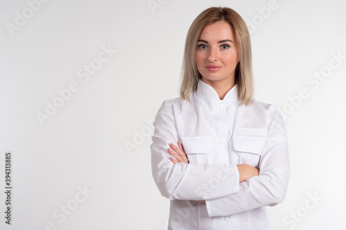 Portrait of a blonde in a white coat. Girl in a white uniform. Woman on a light background looks into the camera. Concept - a woman works in the field of cosmetology or medicine. Businesswoman
