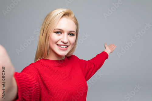 Portrait of a blonde woman making selfie photo on smartphone isolated on a white background