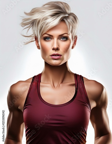 portrait of a blonde woman runner wearing a dark red bordeaux top on a white background