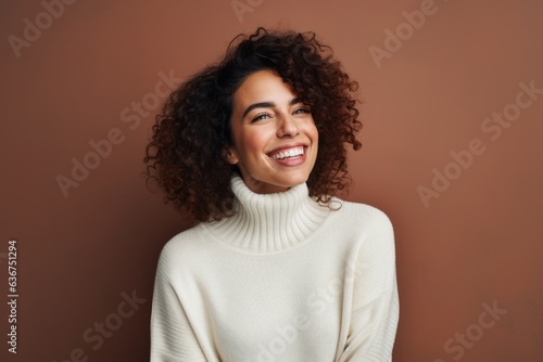 Portrait of a Brazilian woman in her 30s in an abstract background wearing a cozy sweater