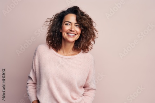 Portrait of a Brazilian woman in her 40s in a pastel or soft colors background wearing a cozy sweater