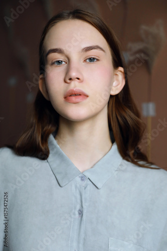 Portrait of a brunette woman. A blue-eyed girl with perfect skin