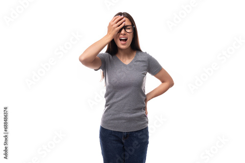 portrait of a caucasian slim young woman in glasses dressed in a gray basic t-shirt and jeans