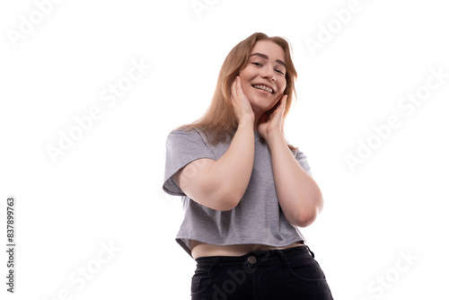 Portrait of a charming teenage girl with braces in a gray T-shirt on a white background