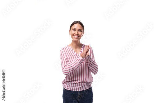 portrait of a charming young brunette office worker woman dressed in a shirt with stripes