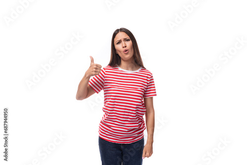 portrait of a charming young caucasian woman with straight hair wearing glasses and a striped t-shirt