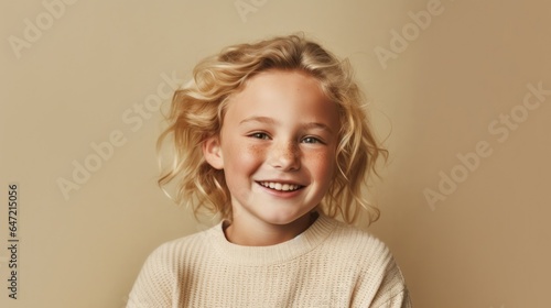 Portrait of a cheerful blonde child, a young girl, wearing neutral clothes, beaming happily against a studio light beige backdrop. Generative AI