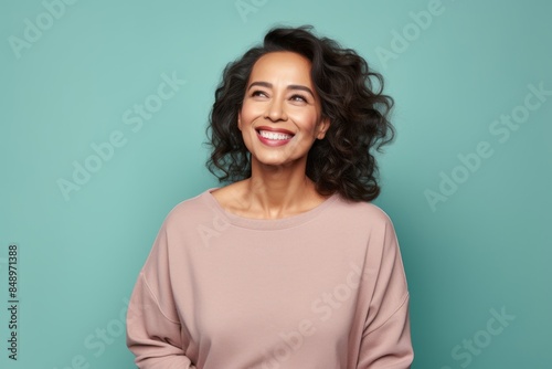 Portrait of a cheerful indian woman in her 50s dressed in a comfy fleece pullover in front of solid pastel color wall