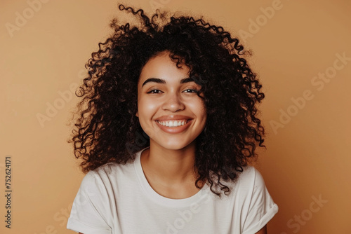 Portrait of a cheerful smiling young brunette with afro hair on pastel background. Generative AI.