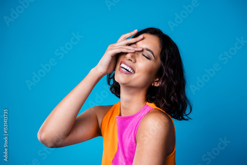 Portrait of a cheerful woman laughing and covering her face while enjoying a moment of happiness on a vibrant blue background